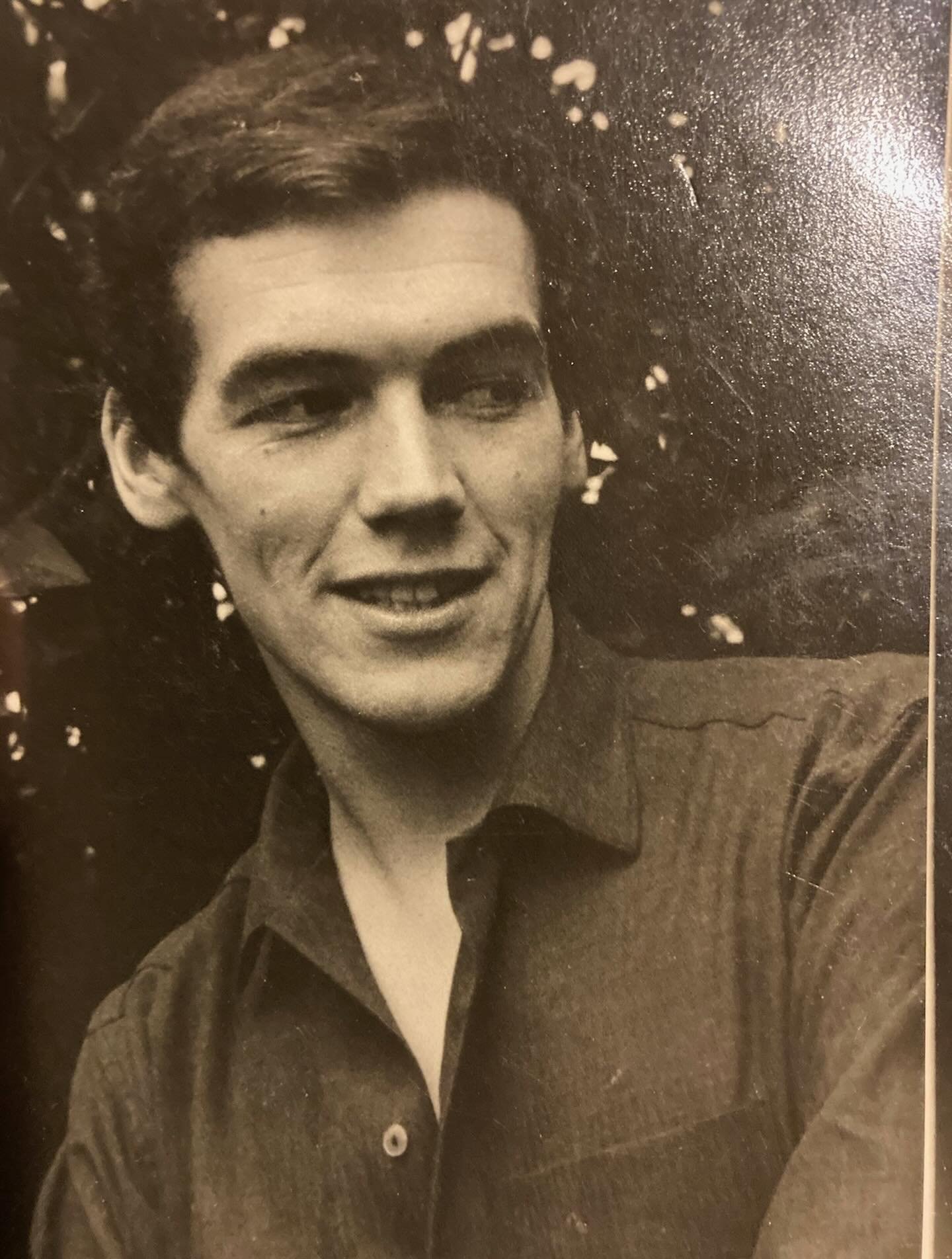 A black-and-white photo of a man sitting on a step, wearing sunglasses, shorts, and sandals. Behind him is a drawing of a biblical scene depicting Jesus Christ carrying the cross.